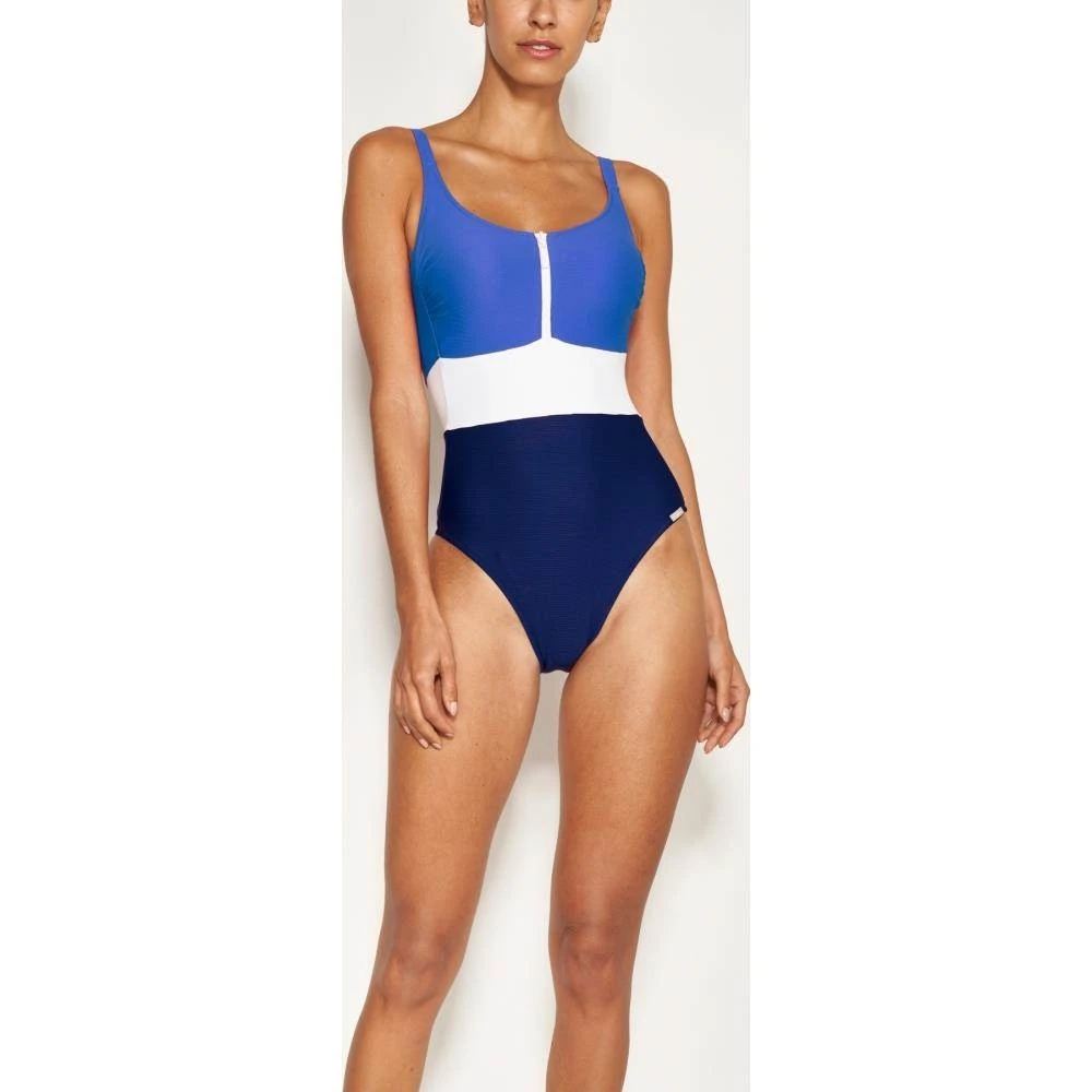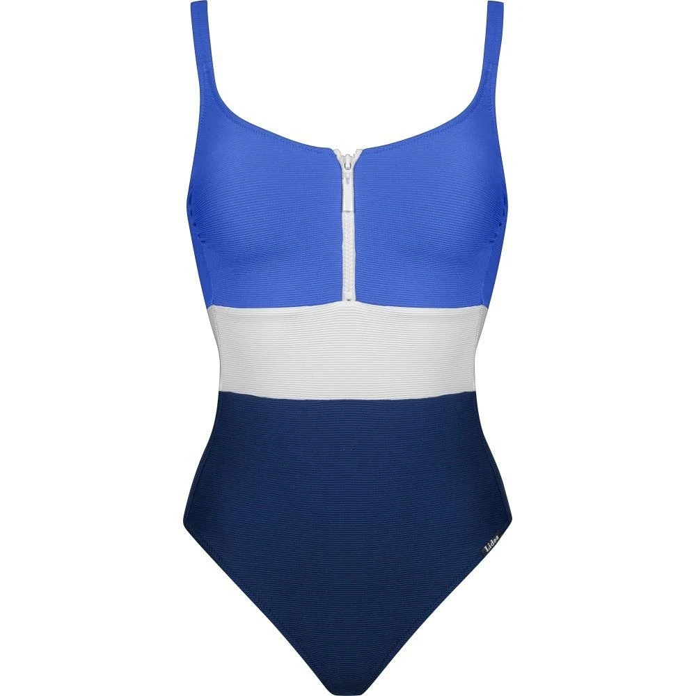 LIDEA Just fits! Bademode für perfekte Tuchfühlung mit dem eigenen Körper – in den Cup-Größen A bis H, für jede Kurvenprägung, bei jeder Bewegung dank Support Level light, medium oder extra. Colourblocking mit unverbrauchter Aussagekraft. Ein moderner Look, der durch die Kombination aus kontrastierender Schnittführung und besonderer Rippenstruktur des Stoffs überzeugt. Badeanzug mit weißem Front-Zipper, integrierten Schaumschalen und höhenverstellbaren Trägern.