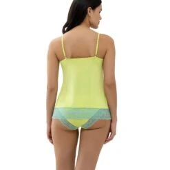 Die edlen Camisoles bestehen aus 57% Viskose, 38% Baumwolle und 5% Elastan. Die Tops mit zarten Spitzenbordüren im Art-Déco-Stil mit V-Ausschnitt fallen durch die fließende Qualität und die weite Schnittform locker. Durch die besonders hochwertige Verarbeitung können die Camisoles auch als Top getragen und zu grobem Strick kombiniert werden.