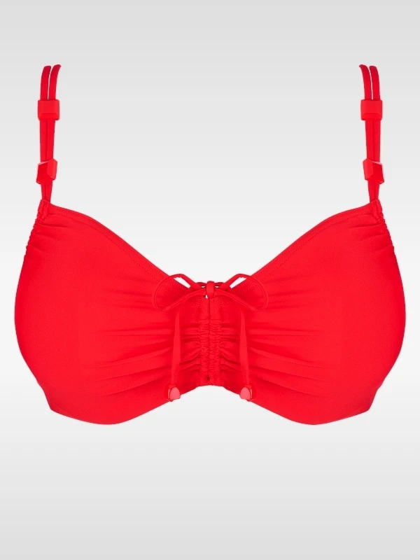 Stilvolles Bikini-Oberteil mit Bügel-BH, aus einem luxuriösen Drapeestoff gefertigt. Die eleganten Spaghettibändchen und der edelsteinähnliche Schmuck steigern die überaus schicke Ausstrahlung noch. Die Höhe des Obercups können Sie selbst mit Hilfe der Schleife am Steg und an den Bändchen einstellen. Der eingearbeitete Bügel-BH aus fester Mikrofaser verleiht dem Busen eine schöne, volle Form. Der Drapee verhüllt etwaige Schönheitsfehler. Mit der Schleife am Steg machen Sie die Oberweite und die Cuphöhe passend.