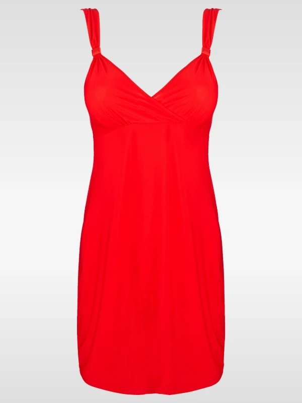Strandkleid aus hauchdünnem Stoff, dass auch als elegantes Sommerkleid getragen werden kann. Das zierliche Drapee und die feinen edelsteinähnlichen Elemente an den Bändchen betonen den raffinierten Look dieses Designs.