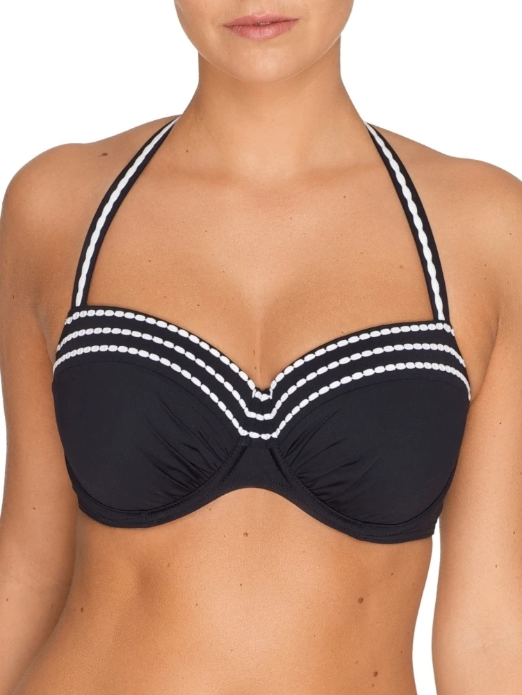 Sexy Bikini-Oberteil mit Bandeau-Ausschnitt mit unterlegten Cups. Das weiße Motiv an den Cups setzt ein volles Dekolleté extra in Szene: umwerfend feminin im Retro-Trend. Die Träger lassen sich verstellen und auch um den Nacken legen. Die weichen unterlegten Cups sitzen bequem und heben den Busen gleichzeitig. Die tief ausgeschnittenen Cups mit eingearbeitetem Grafikmotiv oberhalb – kreieren ein sexy Design. Die mit Stretch gefertigten Träger heben den Busen zusätzlich.
