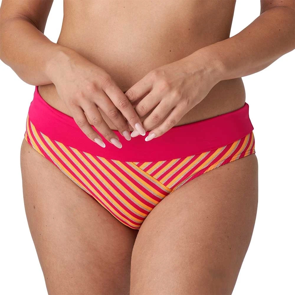 Bikinislip aus gestreiftem Material mit Linienstruktur und einem einfarbigen Einsatz an der Taille.