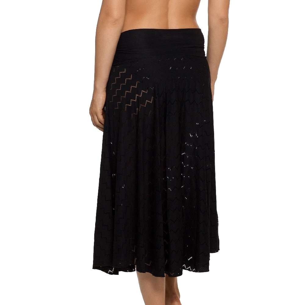 Schulterfreies Kleid oder modisch langer Strandrock? Entscheiden Sie selbst! Aus Bademodenstoff, mit Häkelmotiv. Oben mit glattem Stretchstoff gefertigt; unten fließend und mit Häkelmotiv verziert. Als Kleid getragen schmiegt sich der Stretchstoff sehr schön um den Busen Als Rock schlägt man das obere Teil einfach nach unten und kreiert damit gleichzeitig eine tolle Gürteloptik.