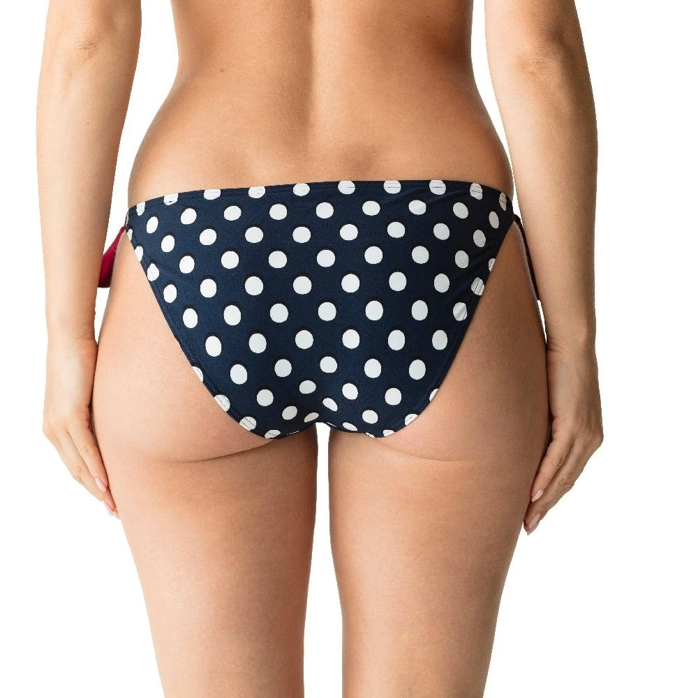 Schleifenslip mit Allover-Tupfen im Retro-Stil und bordeauxfarbenen Bändchen an den Hüften. Die Bändchen können Sie binden, wie Sie möchten, damit der Bikinislip immer perfekt sitzt.