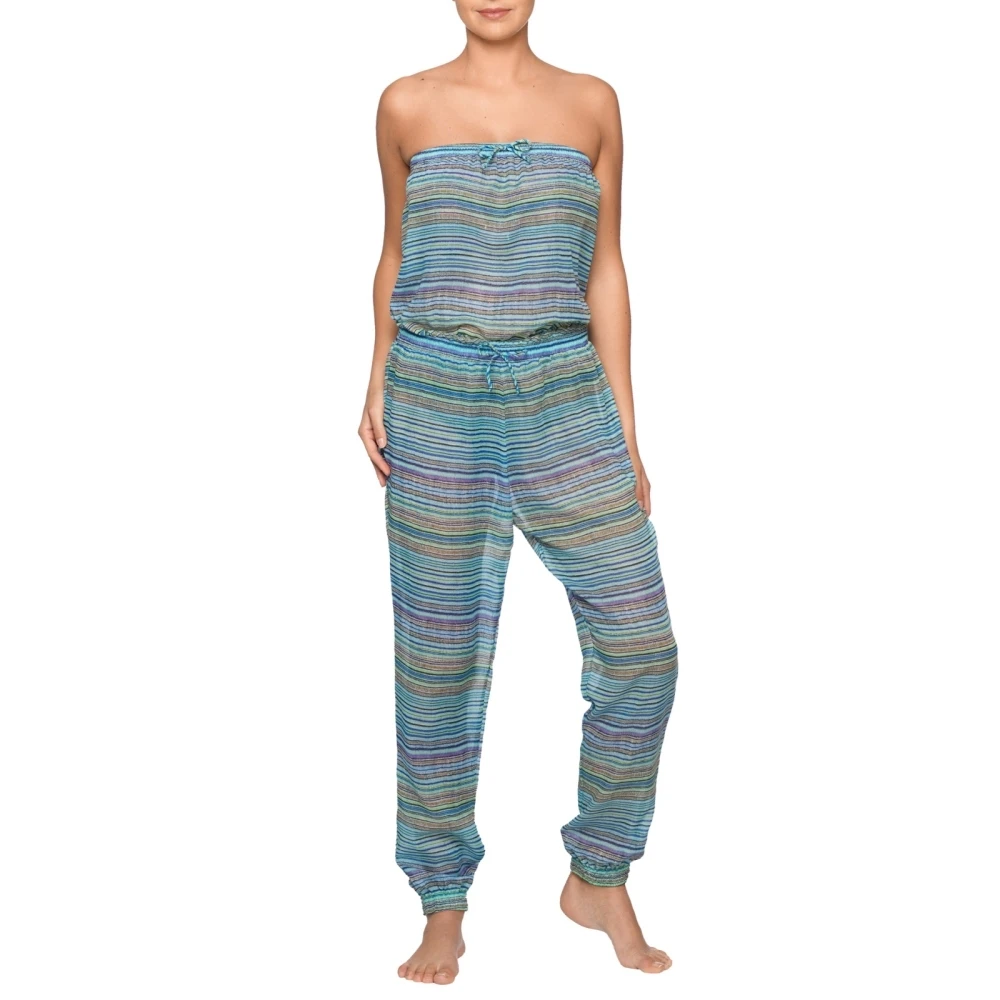 Ein Must-have: ein schulterfreier Jumpsuit mit heiteren Streifen. Leichte Transparenz und ein ausgesprochen luftiger Stoff zeichnen diesen Entwurf aus. Mit den Schnüren oben und an der Taille kann man die Größe passend machen. Sexy Schultern kommen in diesem Modell zur Geltung. Eine feminine Taille ebenso. Mit halb transparenten Verzierungen, die verspielt und trendy sind.