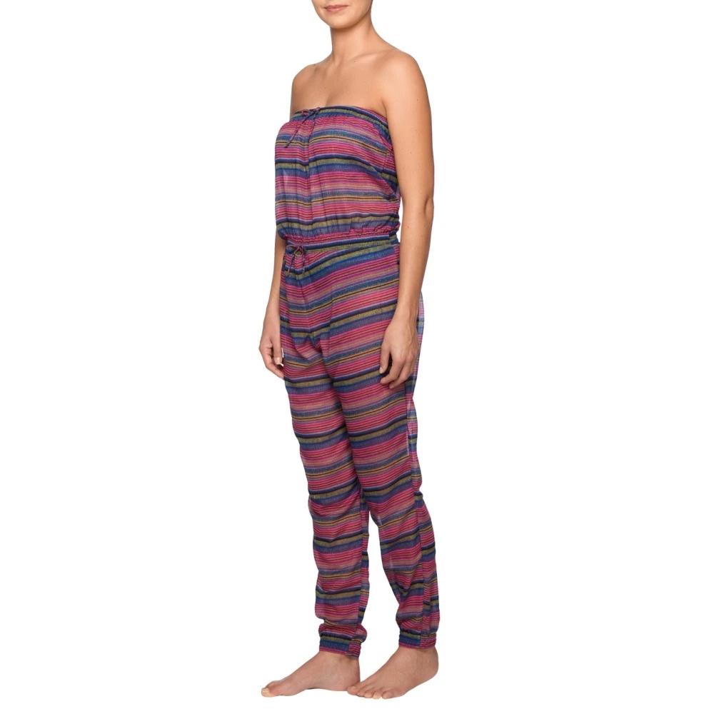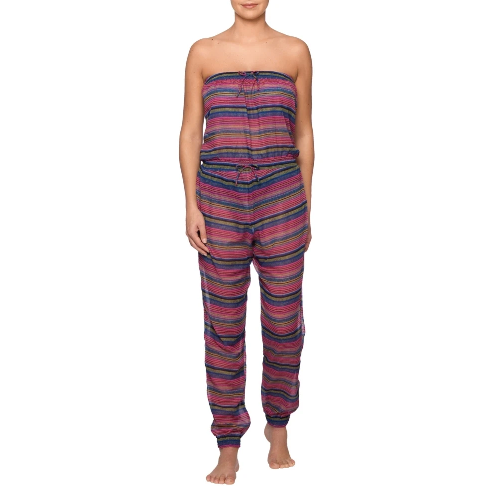 Ein Must-have: ein schulterfreier Jumpsuit mit heiteren Streifen. Leichte Transparenz und ein ausgesprochen luftiger Stoff zeichnen diesen Entwurf aus. Mit den Schnüren oben und an der Taille kann man die Größe passend machen. Sexy Schultern kommen in diesem Modell zur Geltung. Eine feminine Taille ebenso. Mit halb transparenten Verzierungen, die verspielt und trendy sind.