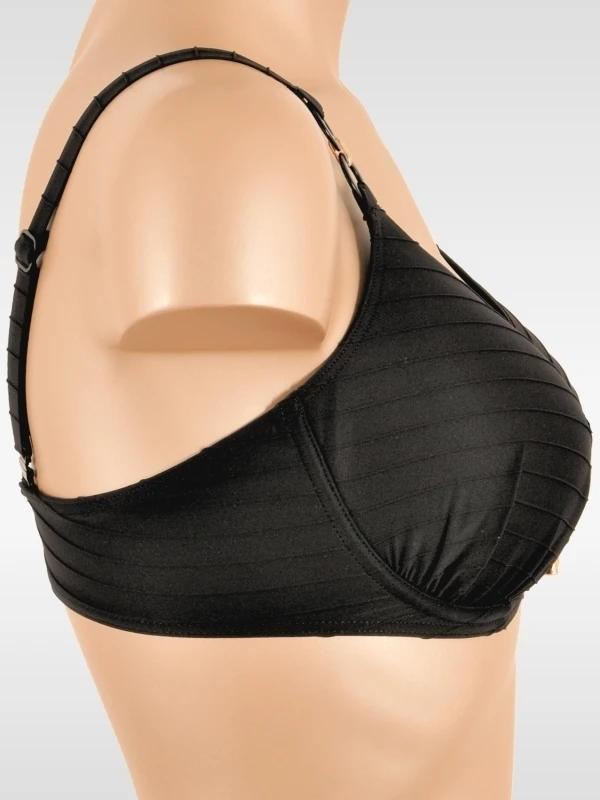 Herzförmiges Bikini-Oberteil mit einer feinen, gestreiften Textur, einem Bügel und vorgeformten, unterlegten Cups. Die Bändchen lassen sich einstellen und auch als Neckholder tragen. Der hübsche Ring und die goldfarbenen Regler am Einstellbändchen verleihen dem Design ein besonderes Cachet.