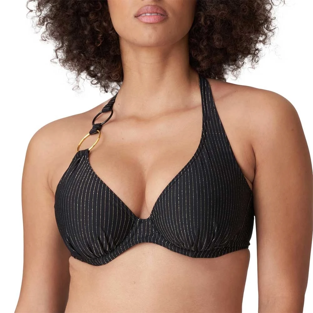 Luftiges halb gepolstertes Bikini-Oberteil mit tiefem Ausschnitt und eingewebten Glitzerstreifen. Die Träger sind asymmetrisch, und einer der Träger ist mit zwei Ringen versehen. Passt perfekt zum Bikinislip im Nineties-Look, der extra hoch am Po sitzt.