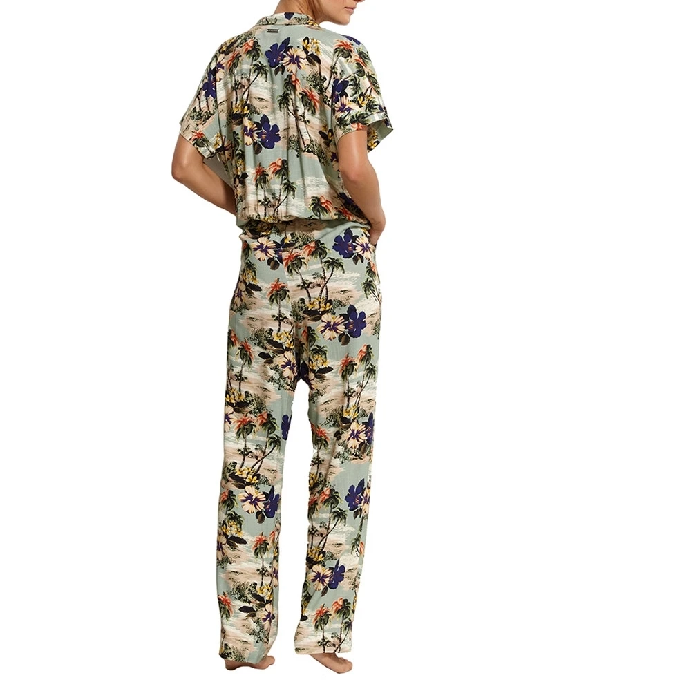 Ein tropischer Print, inspiriert vom hawaiianischen Herrenhemd. Skizzierte Palmen, Blätter, Frangipani, Hibiskus, verblasstes Rosenwasser und pastellige Minze auf jadegrünem Hintergrund verleihen pures Hawaii Feeling.